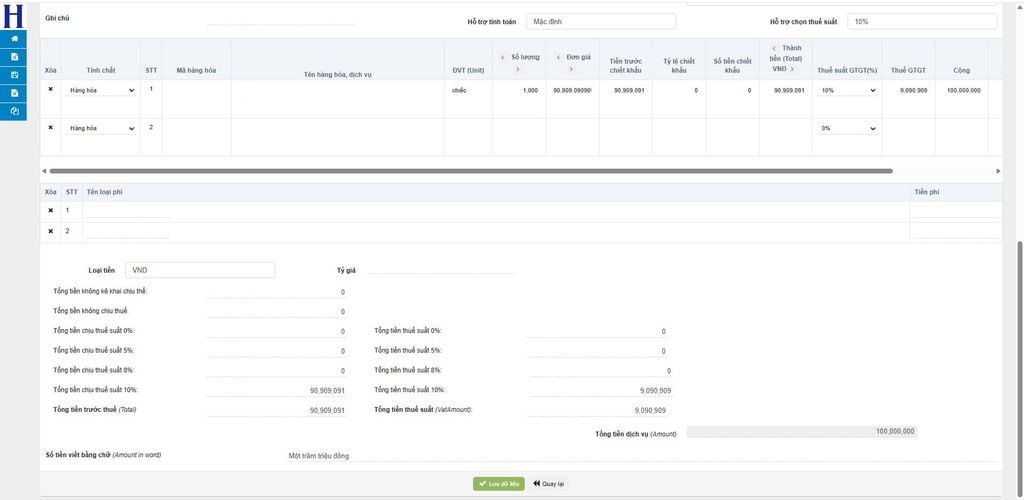 Ví dụ: Đơn hàng 100,000,000 VNĐ với VAT 10%, số lượng sản phẩm là 1,000 thì đơn giá sẽ nhập là 90,909.090909